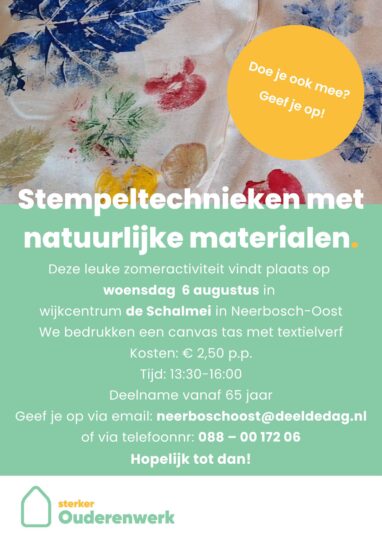 Op woensdag 6 augustus kunnen 65+ers met Deel de Dag in de Schalmei van 13:00 tot 15:30 canvas tassen bedrukken met natuurlijke materialen en textielverf.