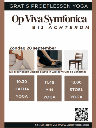 Tijdens Viva Sympfonica op zondag 28 september kun je gratis yogalessen volgen bij Achterom. De lessen zijn in De Schalmei, je kunt verschillende yoga soorten uitpriberen, om 10:30 Hatha, 11:45 Yin en 13:00 Stoelyoga. Meld je aan via www.achterom.org.