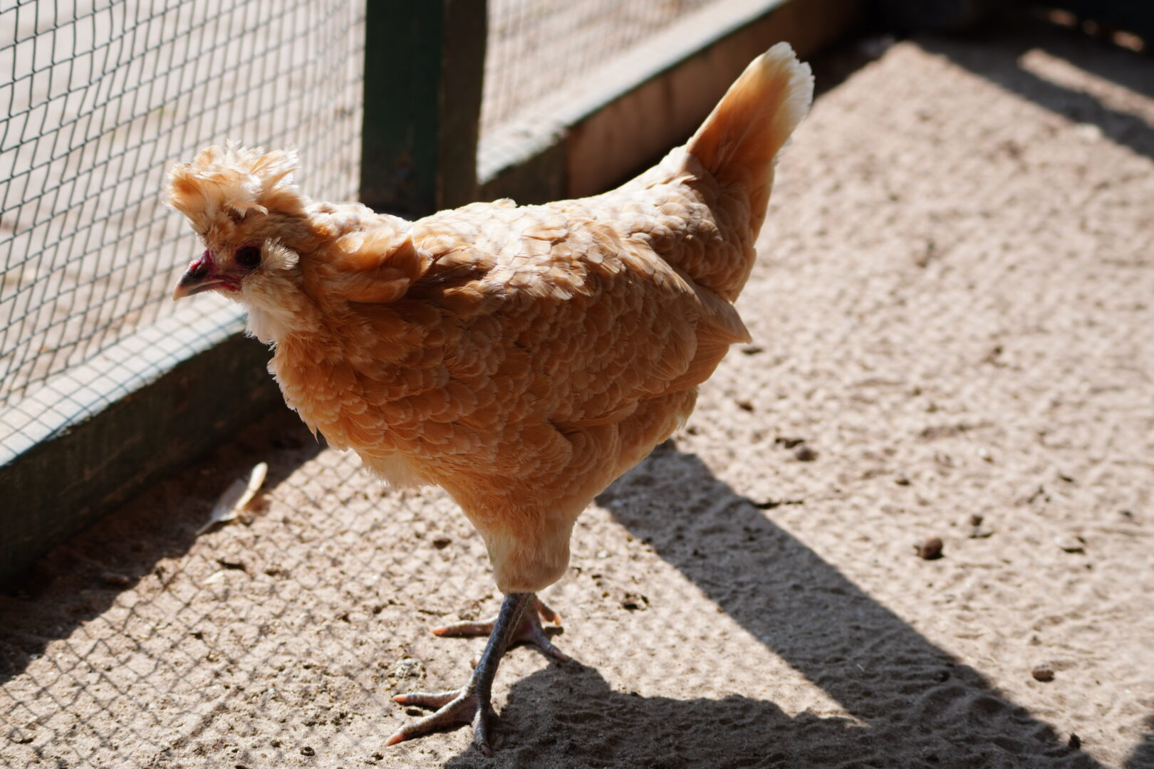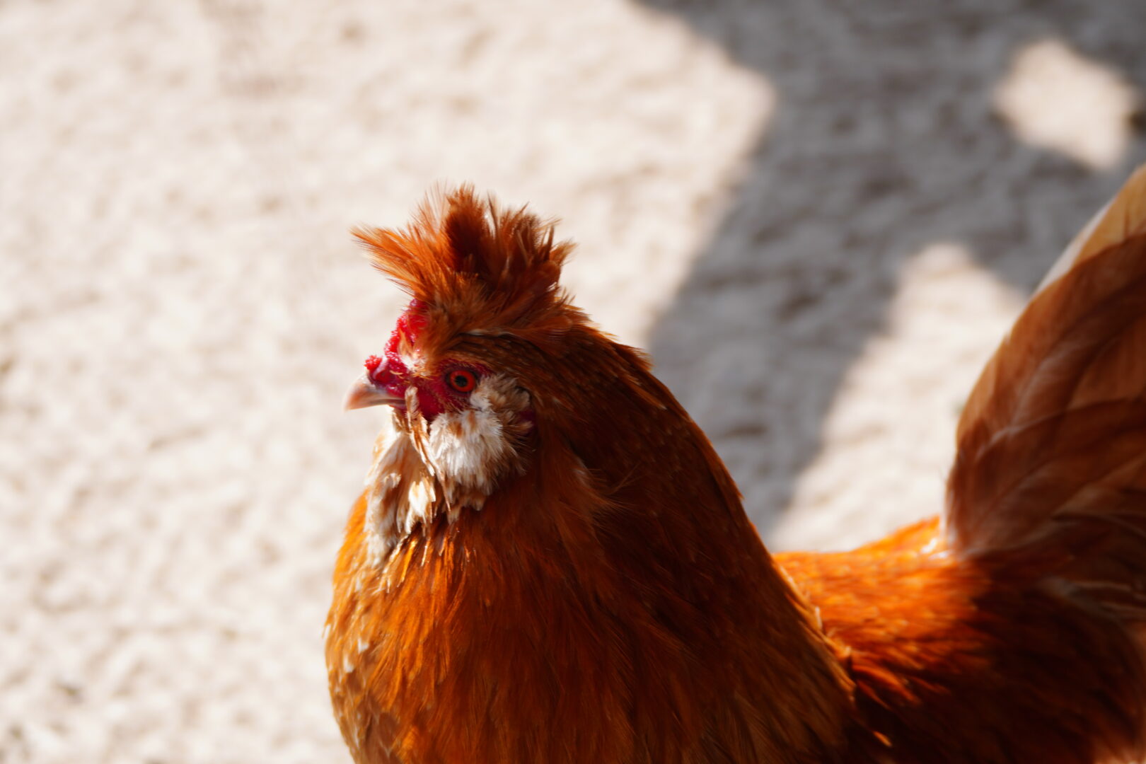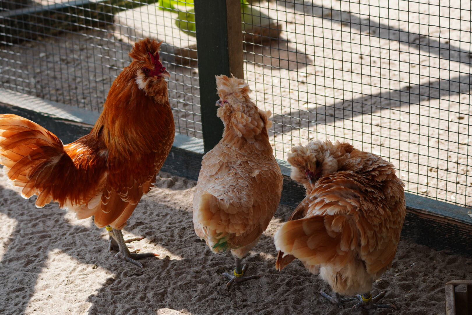 We hebben momenteel twee hennen, één haan én een kuiken, geboren op ons erf. Het zijn erg grappige beestjes om te zien met hun baard en hun kuif, de haan lijkt zelfs twee hoorntjes te hebben. Hoewel ze er grappig uitzien zijn het geen doetjes; ze hebben zelfs eens een muis doodgemaakt. We hebben gelukkig niet gezien hoe, maar het is wel stoer. Ook om ze te vangen voor een gezondheidscontrole zijn het niet de makkelijkste, ze kunnen nogal hoog springen. Één van onze dierverzorgers, Mike had ooit bijna zijn gezicht open liggen, want ze kunnen flink krabben met hun nagels. Dat is geen kwaadaardigheid maar meer schuwheid, want kom je in hun leefruimte zónder lekker eten, maken ze zich meteen uit de voeten. Dat wil zeggen, kom je met een lekker hapje dan komen ze wél uit je hand eten. Zeg niet dat kippen dom zijn…