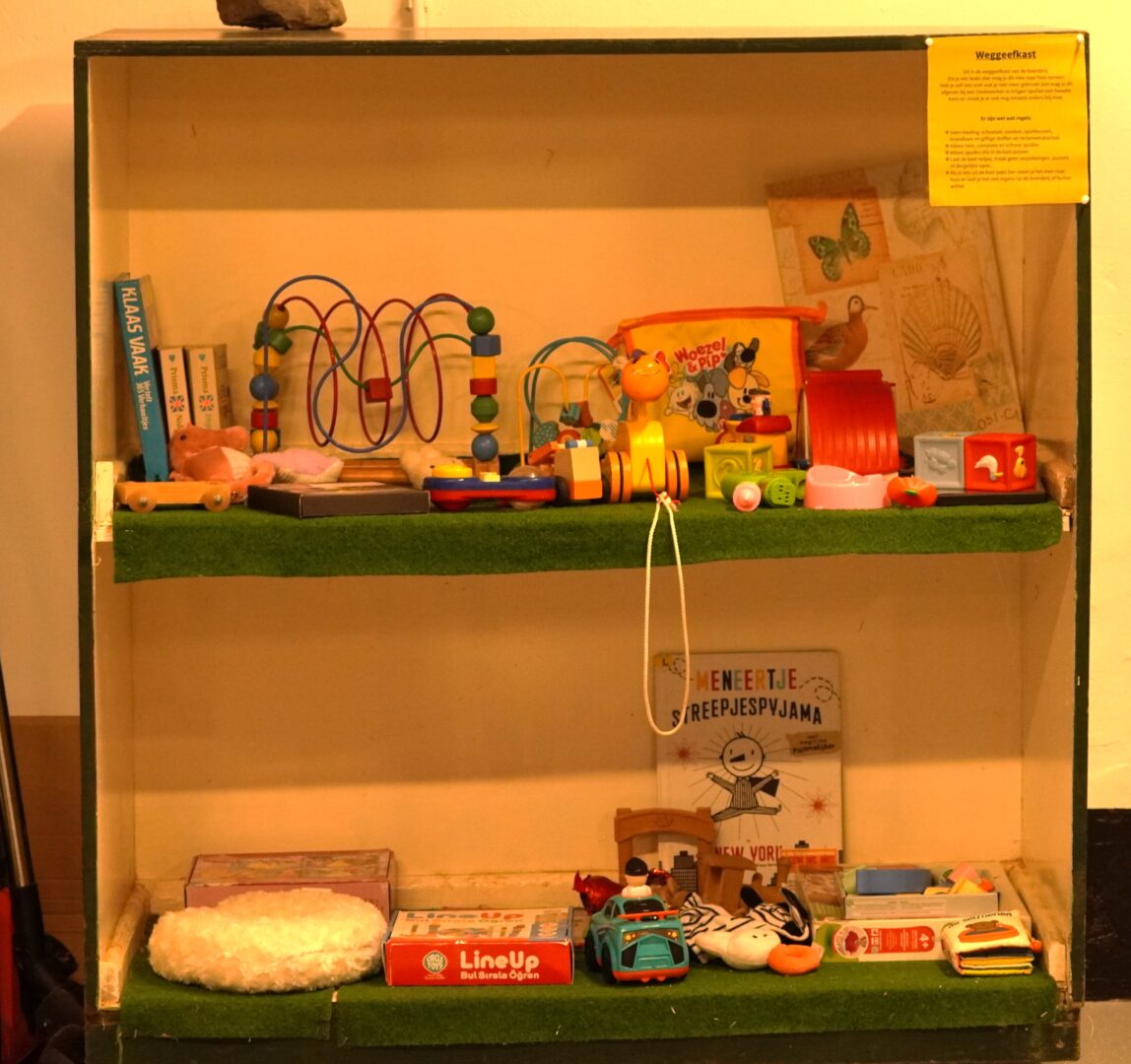 Zo hebben we bijvoorbeeld een Weggeefkast: iedereen kan spulletjes die hij of zij niet meer gebruikt, maar nog wel goed zijn, komen brengen. Andere bezoekers kunnen die spulletjes dan weer gratis meenemen. Zo maak je mensen blij met dingen die je toch maar ergens hebt liggen EN wie weet ligt er wel iets leuks voor jou in die kast. Dat mag je dan ook meenemen.