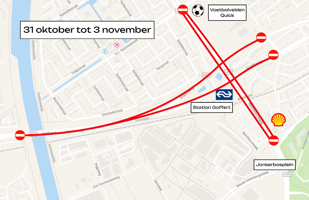Van vrijdagavond 24 oktober 21:00 uur tot maandagochtend 27 oktober 06:00 uur is het Nelson Mandelaplein voor een groot deel afgesloten. Eén rijbaan blijft open: van het Jonkerbosplein (bij de Shell) naar het Gaziantepplein (de ANAC-rotonde). Op het plaatje zie je welke wegen dicht zijn. Neerbosch-Oost is via de Neerboscheweg vanaf beide kanten te bereiken.