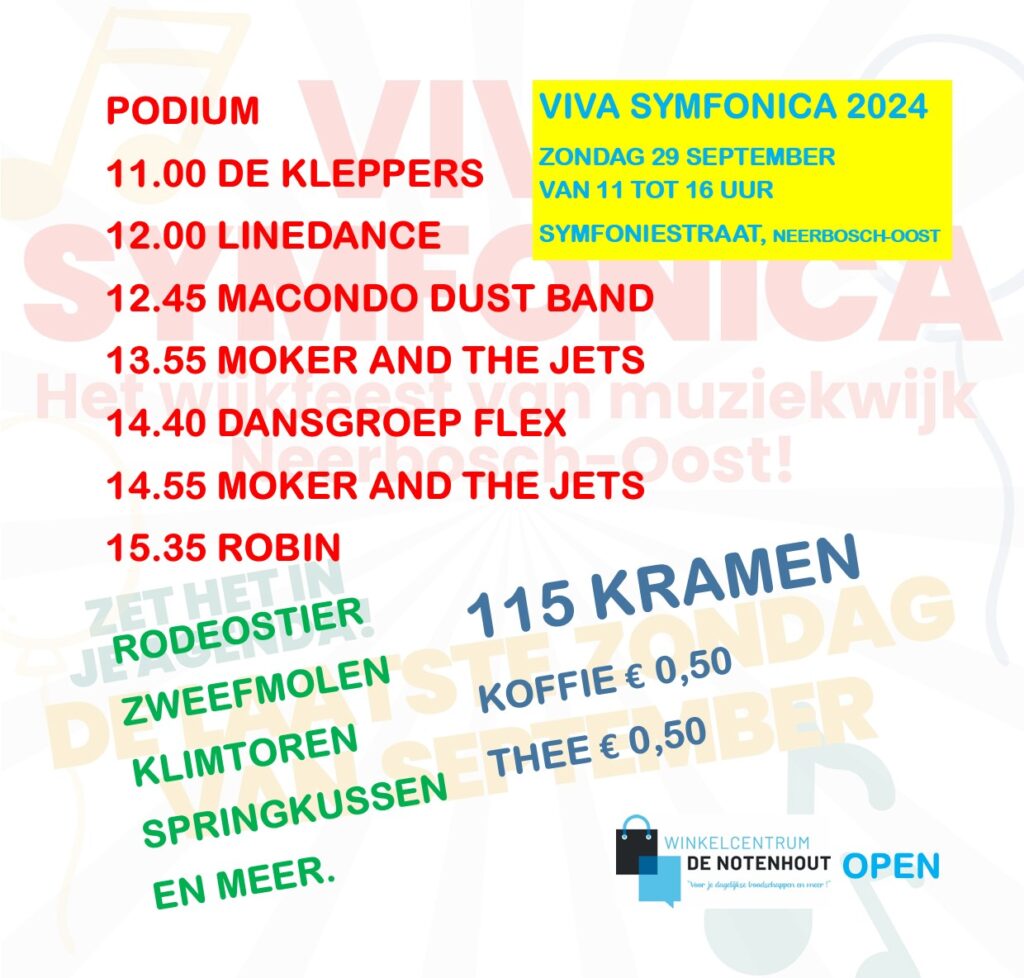 Omdat Neerbosch de muziekwijk is heeft Viva Symfonica een groot podium met een keur aan optredens. Van 11:00 uur tot 16:00 uur is er vanalles te beleven aan de Symfoniestraat rondom winkelcentrum De Notenhout en wijkcentrum De Schalmei. Met onder andere Moker and the Jets, de Macondo Dust Band en de Kleppers!